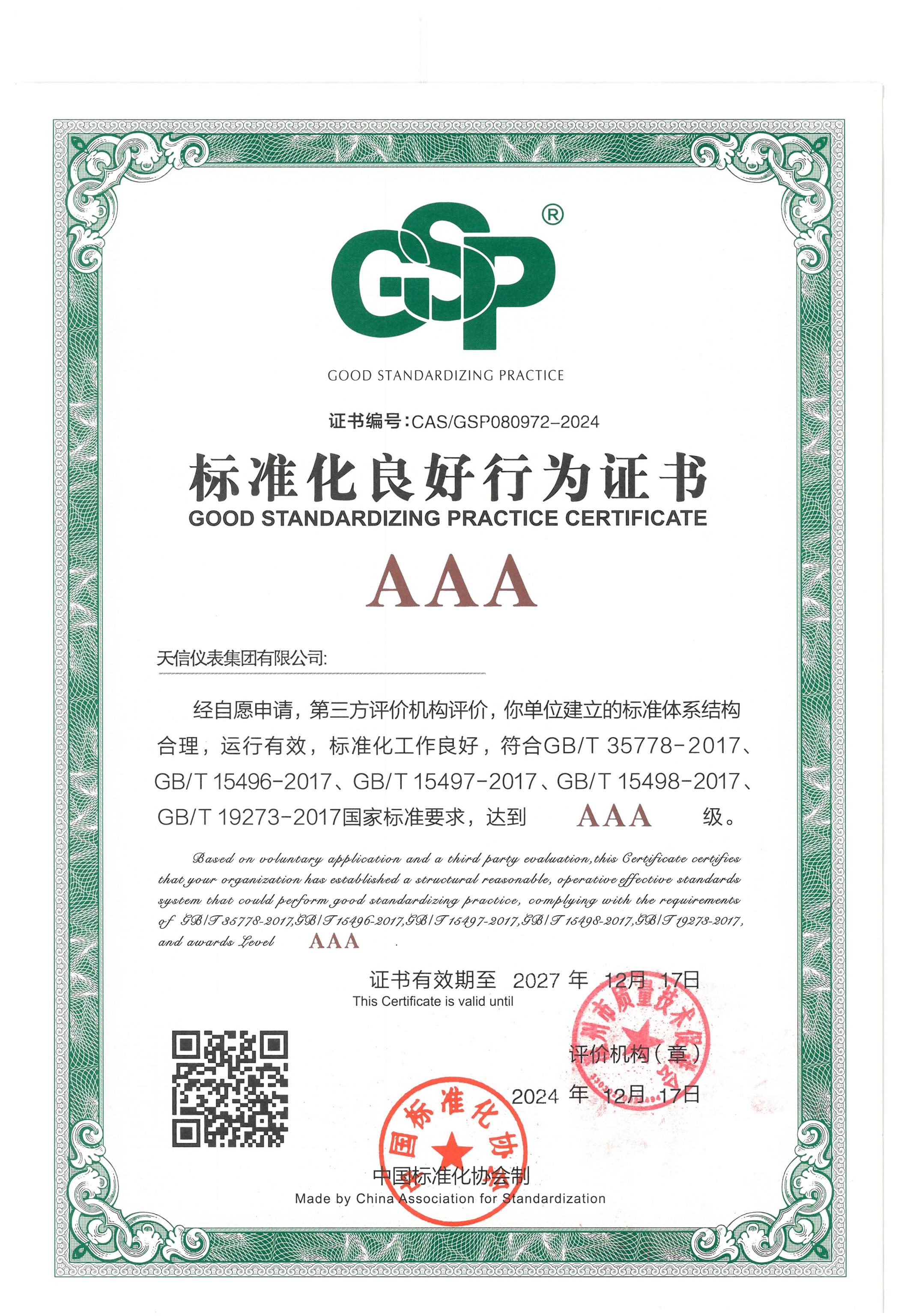 标准化良好行为证书
